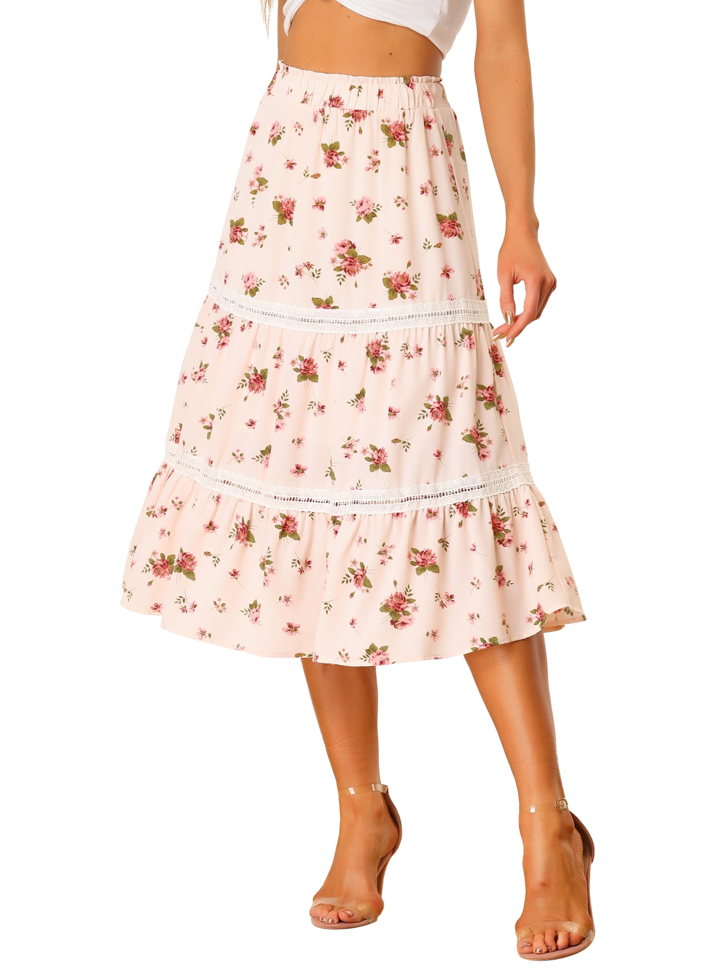 Allegra K Floral Chiffon Skirts For Women S Elastic Waist Tiered Flowy Midi Skirts Walmart Com